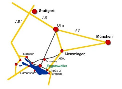 Autobahn A96 bis Abfahrt Weißensberg, dann Richtung Lindau bis Abfahrt nach Oberreitnau. Dort befindet sich auch schon die Ortschaft Eggatsweiler.